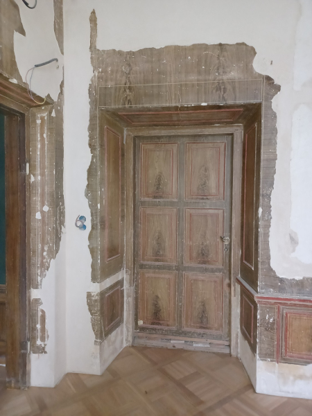 Ściana południowa z drzwiami do Salonu Malinowego, którą przygotowano do rekonstrukcji polichromowanej dekoracji mazerowanej fot. Irma Fuks-Rembisz