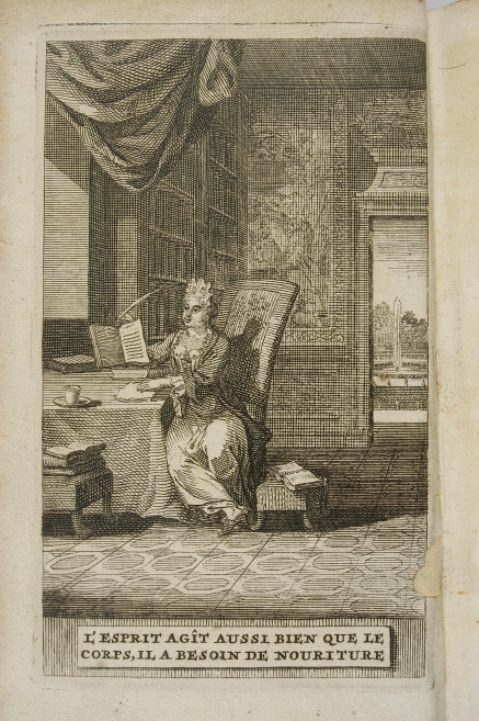 Stara rycina. Przedstawia wnętrze pokoju i siedzącą przy stole kobietę. Stół i krzesło są po lewej stronie. Kobieta siedzi lekko skręcona w swoją lewą stronę na fotelu z wysokim oparciem. W jednej ręce trzyma pióro, drugą opiera na liście. Za stołem po lewej biblioteka i kotara umocowana pod sufitem. Po prawej stronie, w oddali widać drzwi z widokiem na pejzaż.