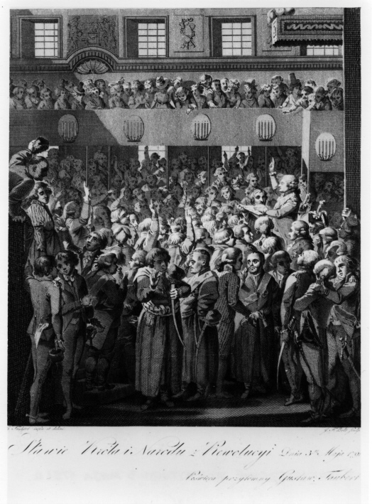 Stara rycina. W centrum kompozycji królowa w koronie na głowie, trzymająca w prawej ręce berło. Rozkłada szeroko ramiona i swoim płaszczem obejmuje ludzi, którzy stoją przed nią. Są to dwie elegancko ubrane kobiety i dwóch mężczyzn, ukazanych od tyłu. W tle obelisk i dwie tarcze. Na jednej z nich orzeł w koronie, an drugiej rycerz na koniu. Rycina przedstawia Alegorię Konstytucji 3 Maja 1791 r.